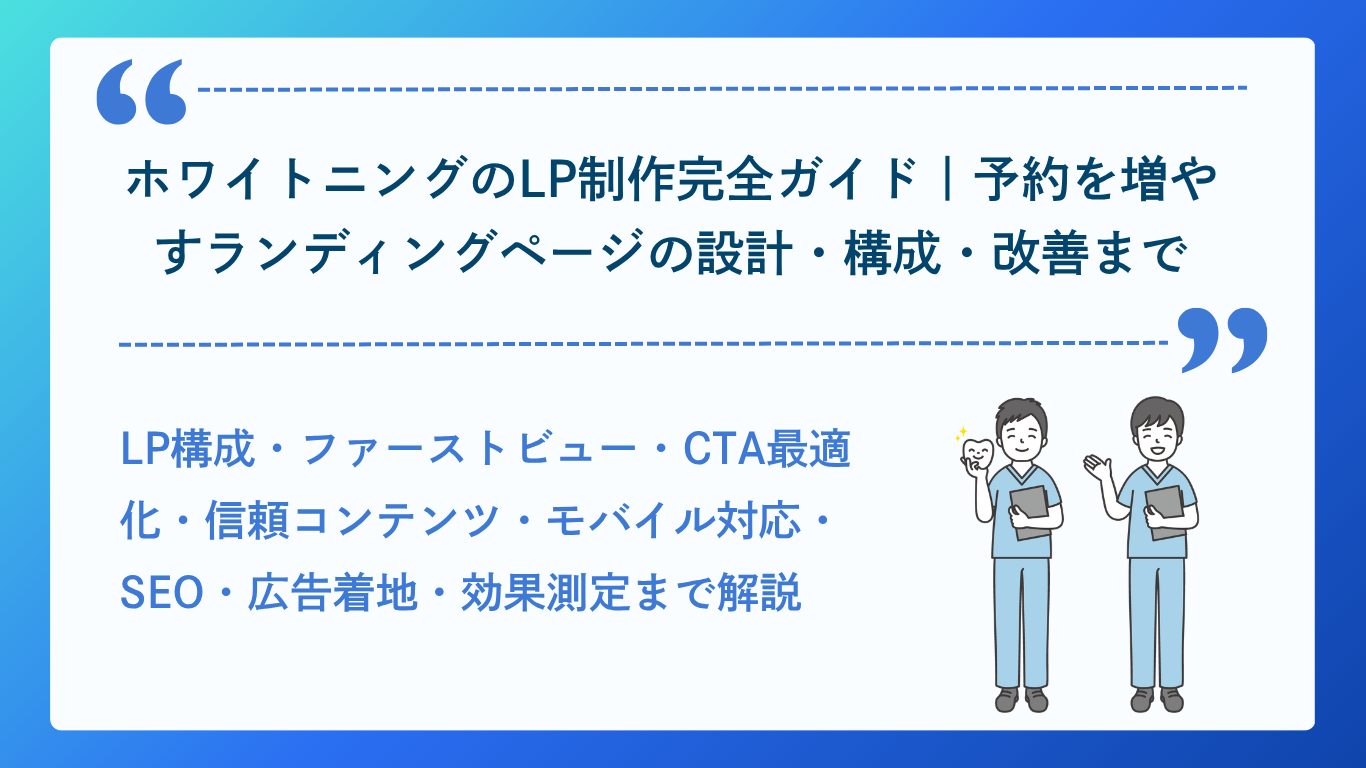 「ホームページを持っているのに、ホワイトニングの予約が全然入らない」「サイトを見てもらっているのに問い合わせに繋がらない」「競合医院のホームページと何が違うのか知りたい」——こうした悩みは、多くの歯科医院に共通する課題です。ホームページは「存在するだけで集患できる」ものではなく、患者の来院を決める意思決定プロセスに寄り添った「設計」が必要です。本記事では、ホワイトニングに特化したホームページの全体構成・LP設計・信頼性コンテンツ・SEO最適化・UX改善・予約導線まで、患者が来院を決めるホームページに必要な要素をすべて解説します。