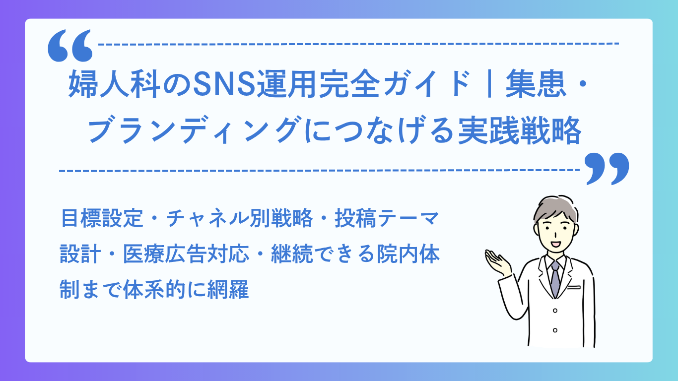 本記事では、婦人科クリニックのSNS運用を、目的設定・チャネル選定・Instagram実践・X実践・YouTube/TikTok・コンテンツ設計・医療広告ガイドライン・院内体制・効果測定まで体系的に解説します。これからSNSを始める婦人科クリニックも、すでに運用しているが成果が出ていないクリニックも、実践に移せる内容をお届けします。
