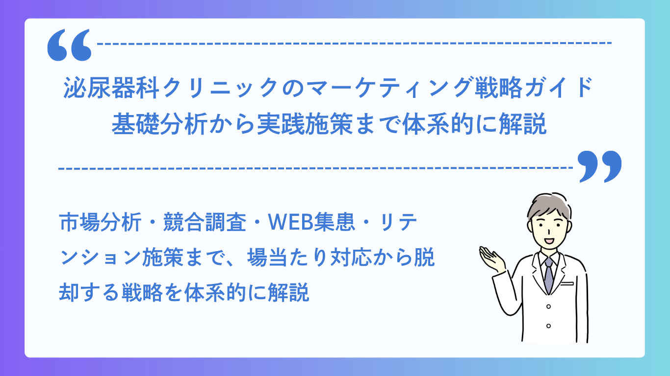 本記事では、泌尿器科クリニックに特化したマーケティング戦略を、分析・ポジショニング・Web施策・自費診療・リテンション・予算管理まで体系的に解説します。すでに取り組んでいる院長にとっても、戦略の見直し・整理に役立てていただける内容です。