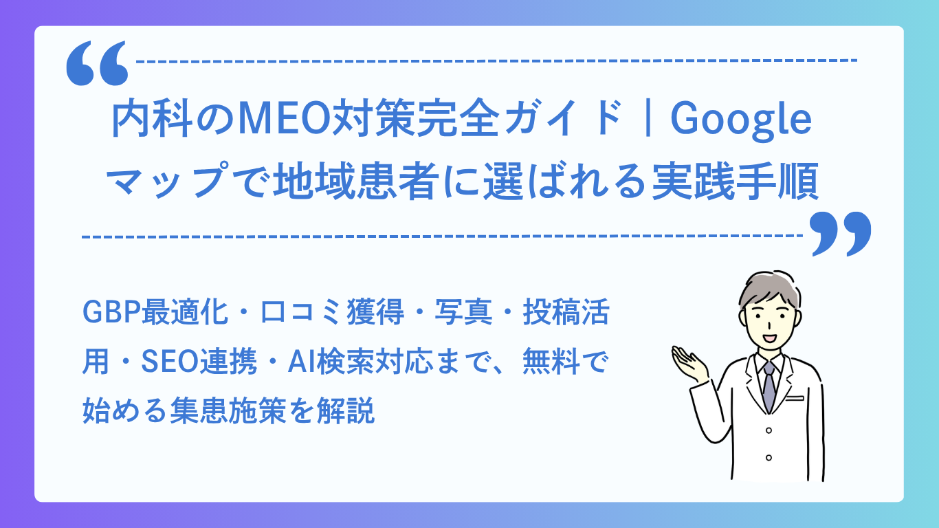 本記事では、MEOの仕組み・Googleビジネスプロフィールの最適化手順・口コミ獲得戦略・写真・投稿機能の活用法・SEOとの連携・効果測定・さらに2026年以降のAI検索への対応まで、内科に特化して体系的に解説します。対策済みの競合が少ない今こそ、MEO対策を最大の集患武器として活用してください。