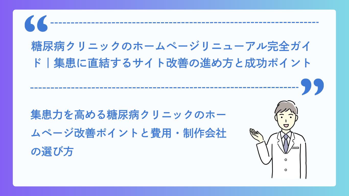 糖尿病クリニックのホームページリニューアルは、単なる「見た目の刷新」ではなく、集患・信頼構築・継続的なSEO集客を実現するための戦略的な投資です。本記事のポイントを振り返ると、①リニューアルのタイミングを正しく見極め既存の課題を数値で把握すること、②院長プロフィール・診療内容・FAQ・オンライン予約など必要なコンテンツを揃えること、③患者が選ぶ理由が伝わるデザインとCTA設計を行うこと、④地域SEOとコンテンツマーケティングを組み合わせた集患施策を実施すること、⑤医療広告ガイドラインに準拠し安全なサイト運用を行うことが重要です。リニューアルを検討されている際は、医療専門の制作会社に相談し、自院の目標・ターゲット患者像・予算に合わせた最適なプランを設計されることをお勧めします。