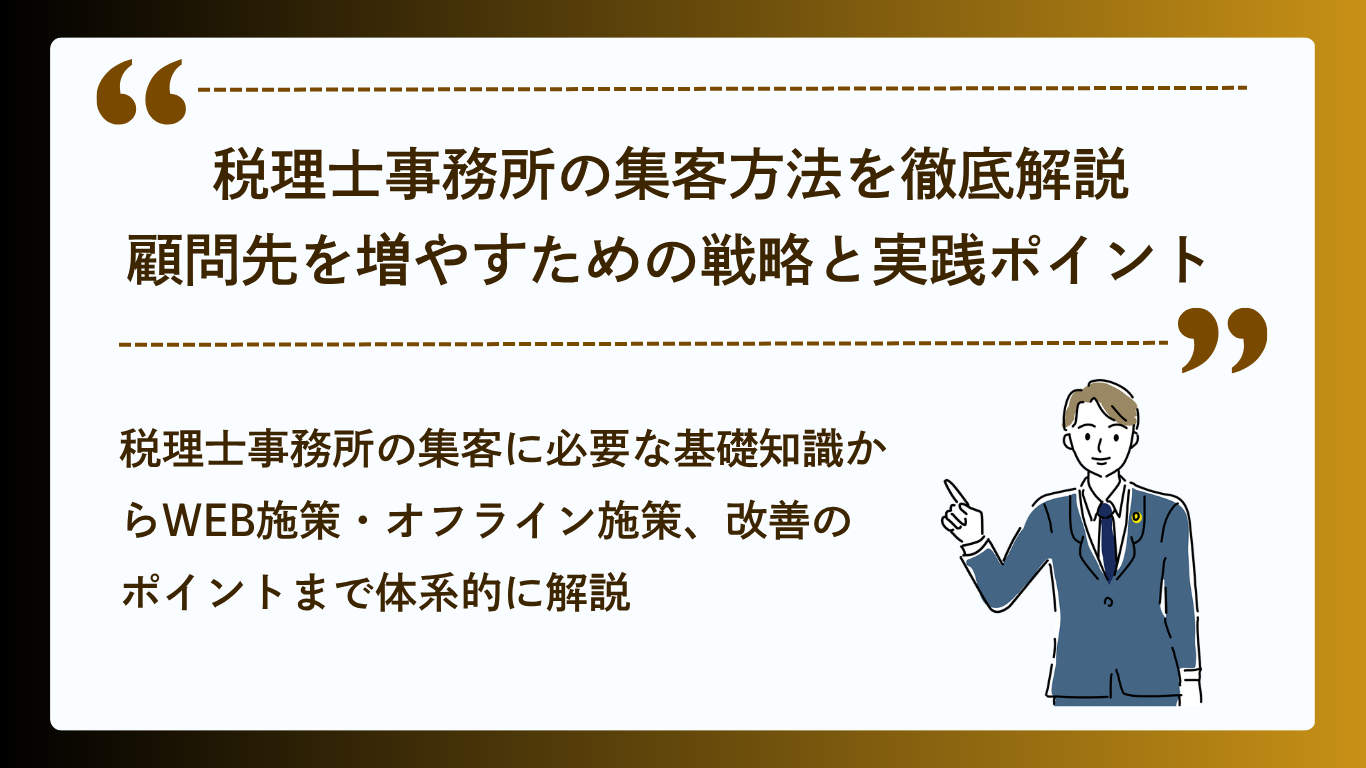 本記事では、税理士事務所が新規顧問先を継続的に獲得するための集客方法を、Web施策からオフライン施策まで体系的に解説します。「何から始めればいいかわからない」という方にも、明日から実践できる具体的なアクションをお伝えします。